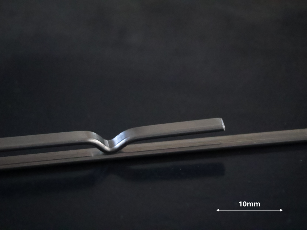 SUS304の平線に対して、プレス曲げと手曲げを組み合わせ、クリップ形状に仕上げた加工事例です。